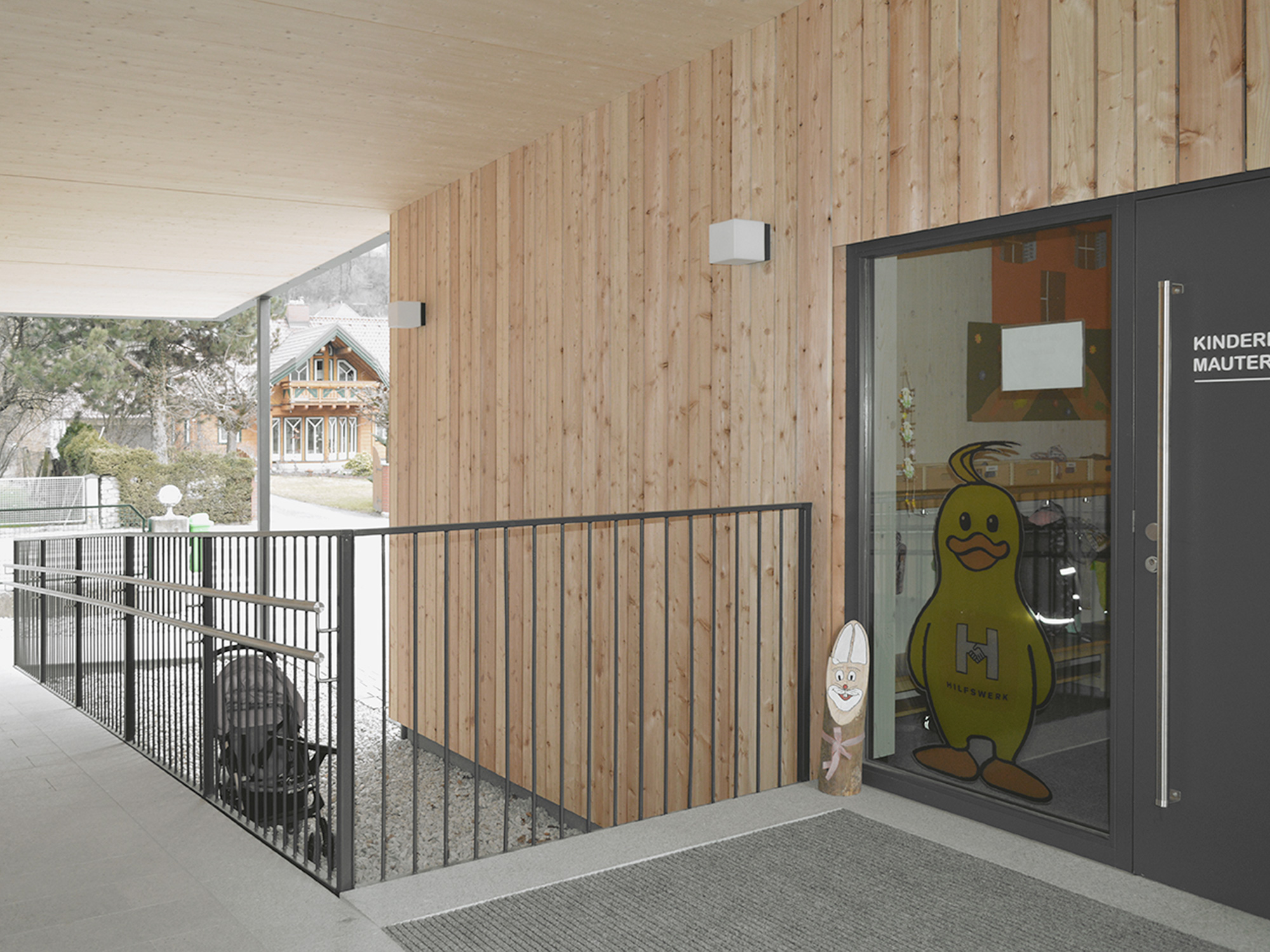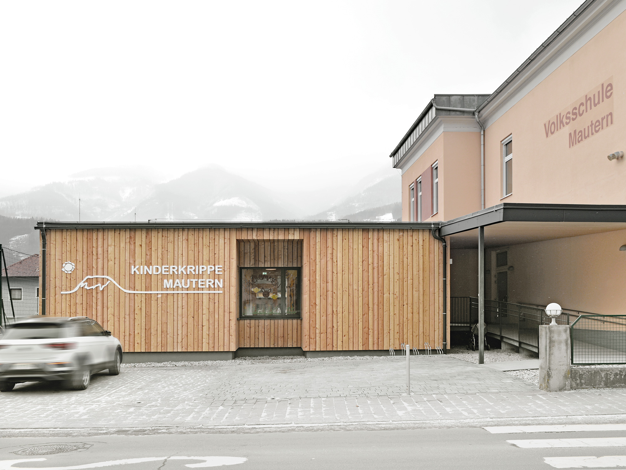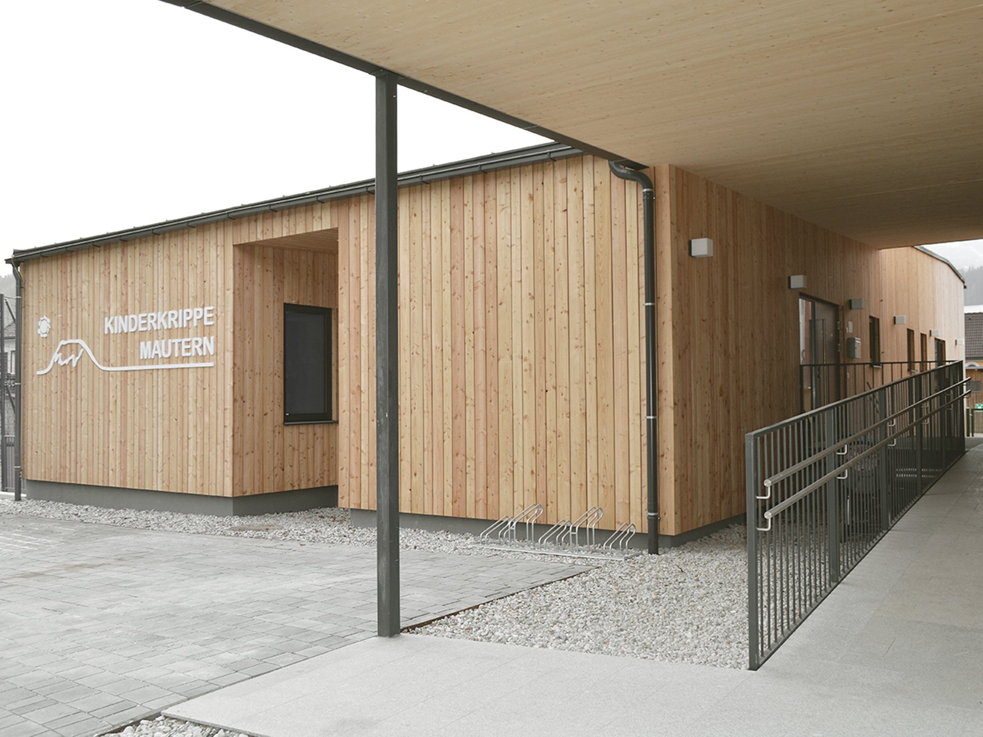 Ein nachhaltiger Holzbau in Form einer Kinderkrippe sorgt in der Gemeinde Mautern nun für die Betreuung der Kleinkinder und bietet durch die natürlichen Materialien ein gesundes Raumklima und eine optimale Luftfeuchtigkeit. In dem einfach strukturierten, eingeschossigen Zubau wurden bewusst fließende Räume und Übergänge geschaffen, sowie eine überdachte Terrasse und ein barrierefreier Zugang beigefügt.