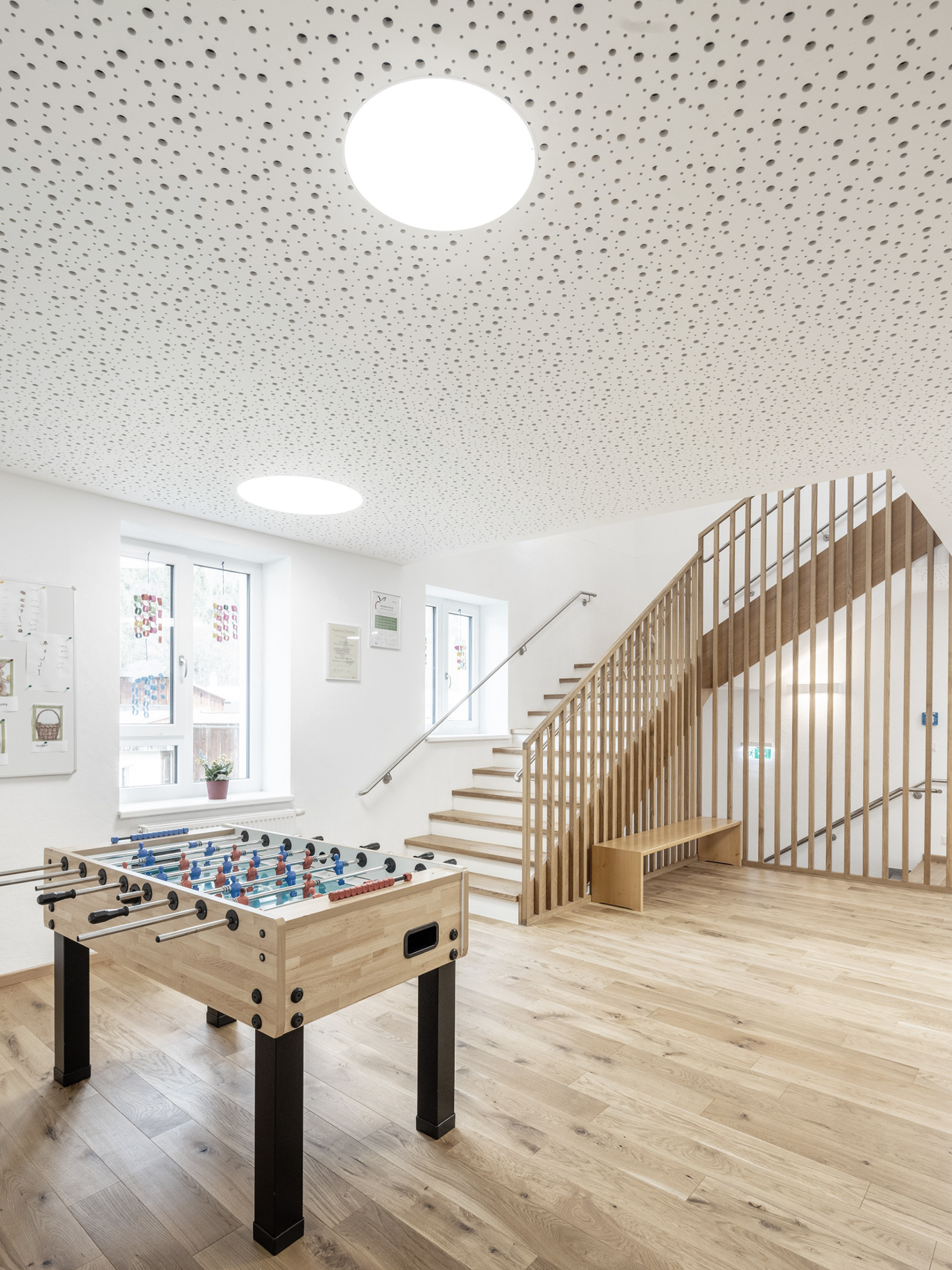 Durch die Reorganisation des Bestandsgebäudes in bester Lage gelingt es der Schule, den Anforderungen der Schüler und Lehrer gerecht zu werden. Ergänzt durch einen neuen Zugang und den eingeschossigen, multifunktionalen Zubau in Holz, welcher durch seine offene Ausstrahlung den Bezug zum umliegenden Dorfplatz herstellt, konnte die Volksschule in Altenmarkt bei St. Gallen optimiert werden.