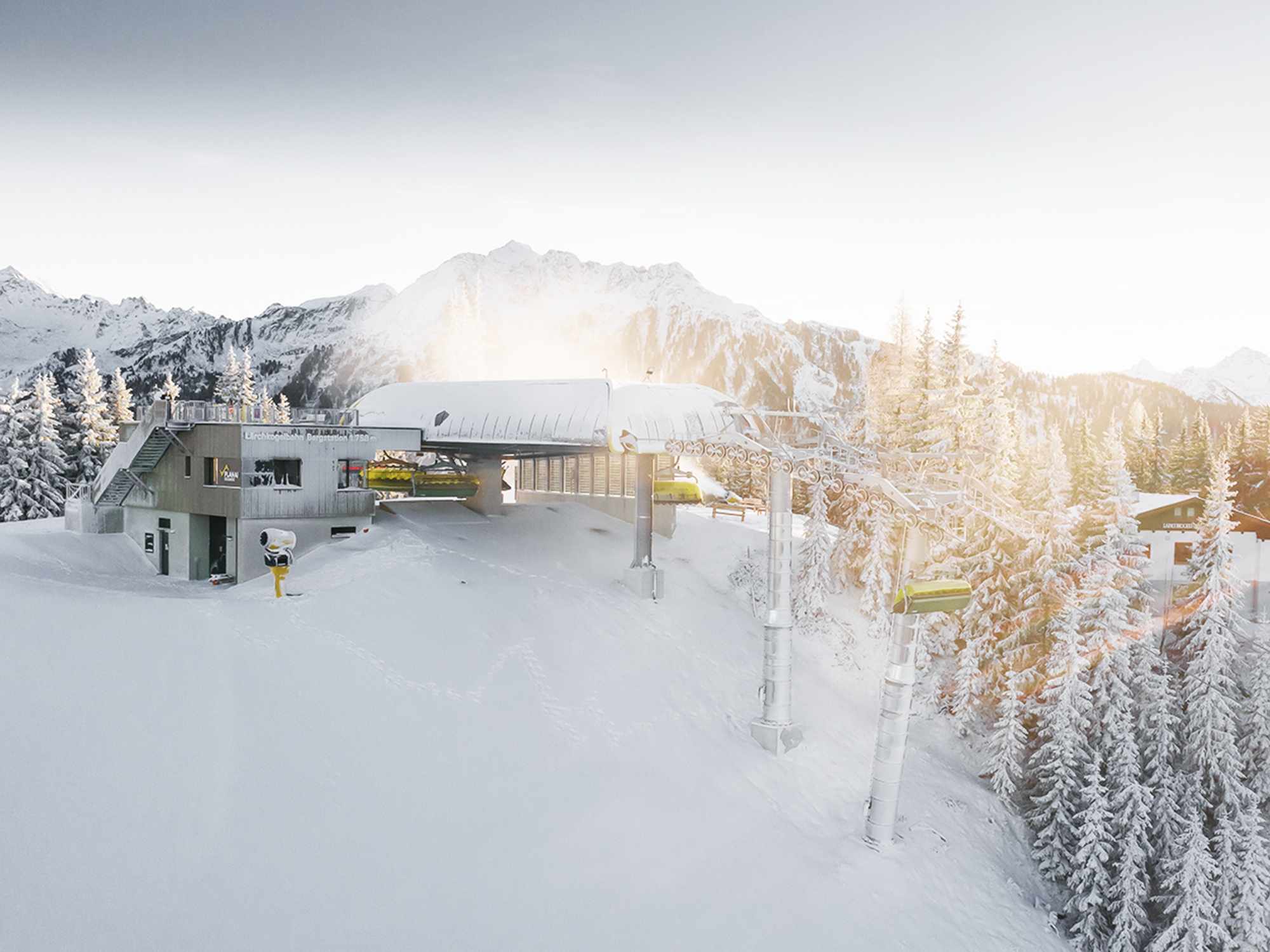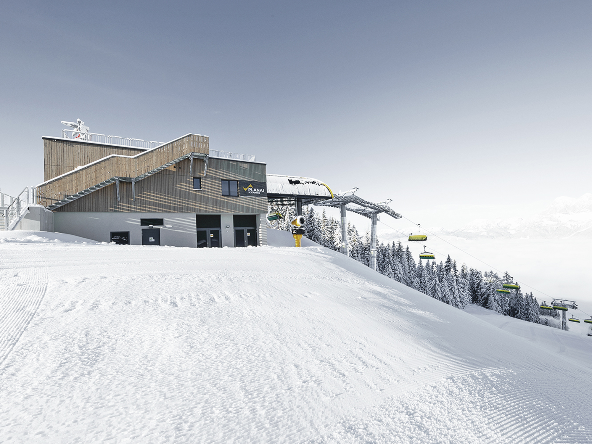 Der Neubau der Tal- und Bergstation der 8er-Sesselbahn Lärchkogel auf der Planai passt sich architektonisch bewusst an die 2019 fertiggestellte Hauptseilbahn an. Die Erhaltung des Naturraumes am Berg sowie die harmonische Kombination aus Form und Funktionserfüllung sorgen auch hierbei gemeinsam mit dem begehbaren Panoramadeck für ein angenehmes, alpenländisches Flair.