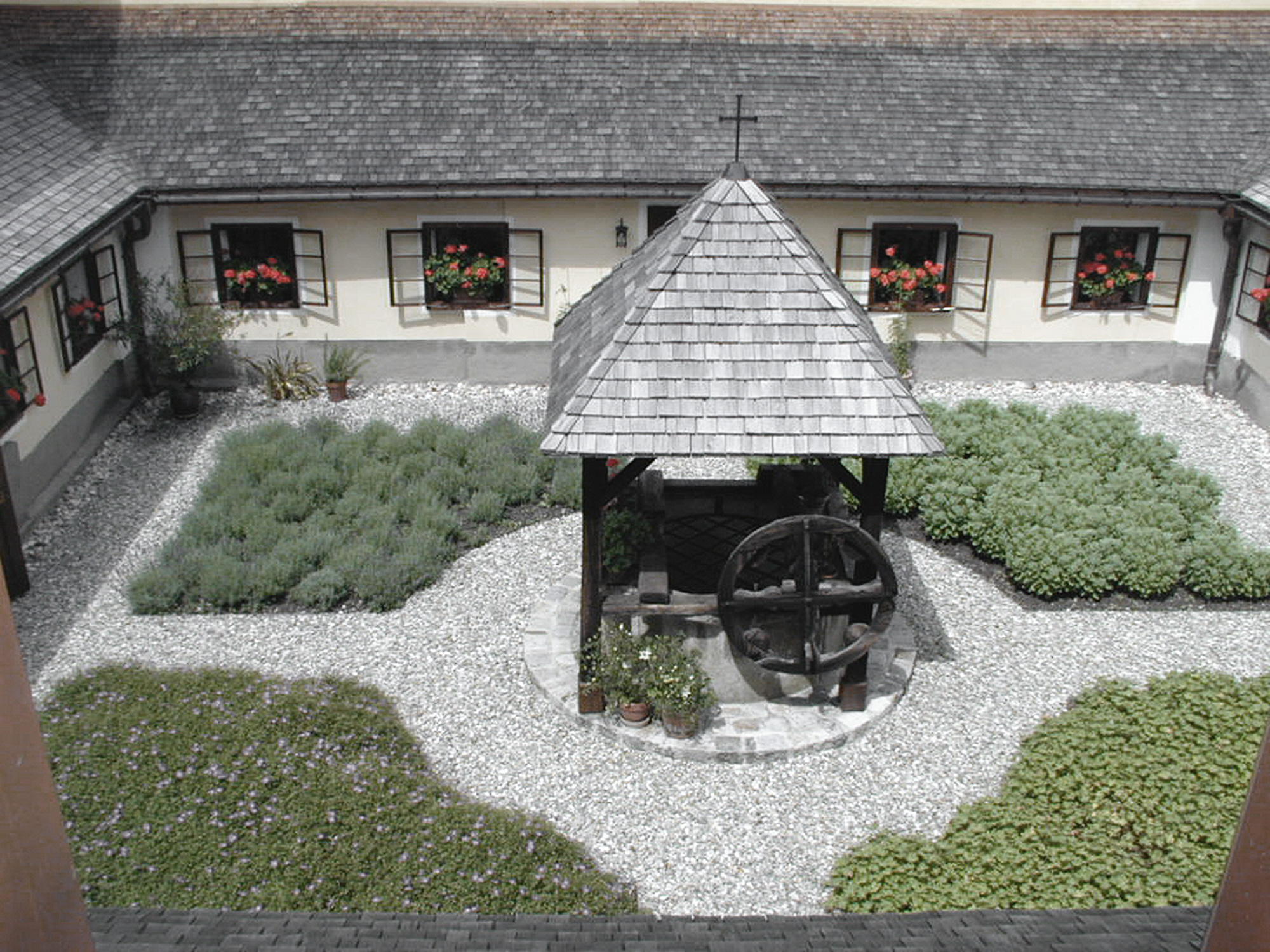Die Revitalisierung erfolgte mit Respekt vor dem historischen Bestand und in enger Abstimmung mit den Ordensbrüdern. Architektonisch entstand ein behutsamer Dialog zwischen Alt und Neu, der die spirituelle Atmosphäre wahrt. Im Außenraum sorgt eine neue Lärchenschindeldeckung für zeitgemäße regionale Akzente, der Innenhof erhielt durch dezente Eingriffe neue Aufenthaltsqualität, und der Rückbau einiger Zellen schuf Raum für gemeinschaftliche Nutzung.