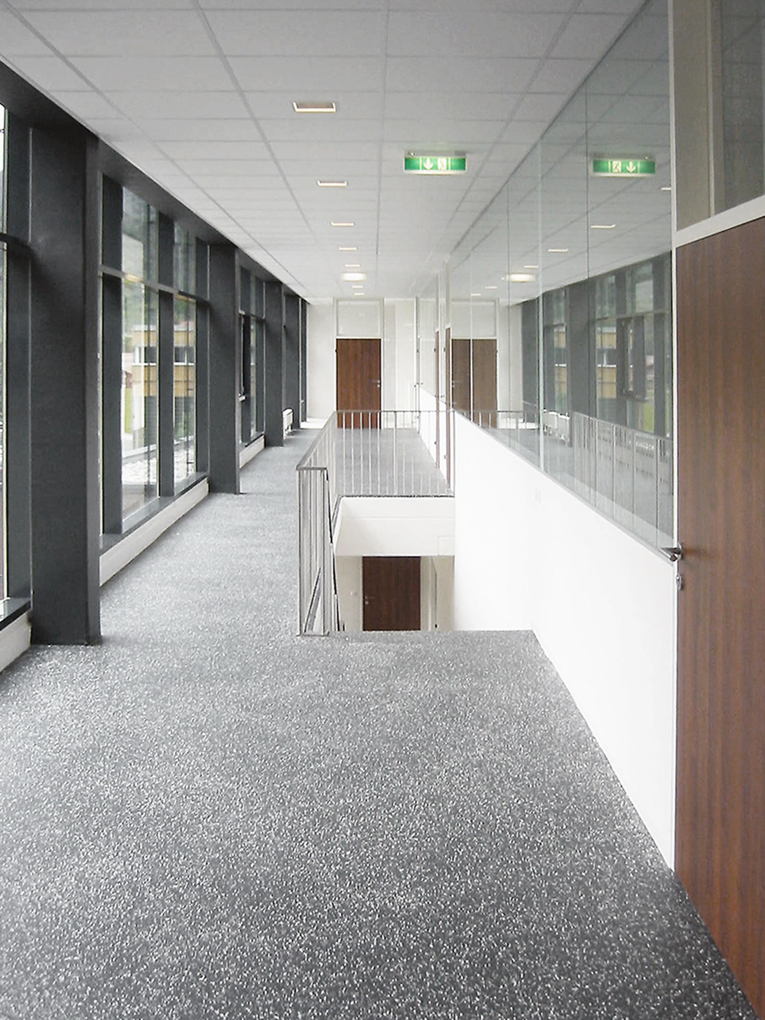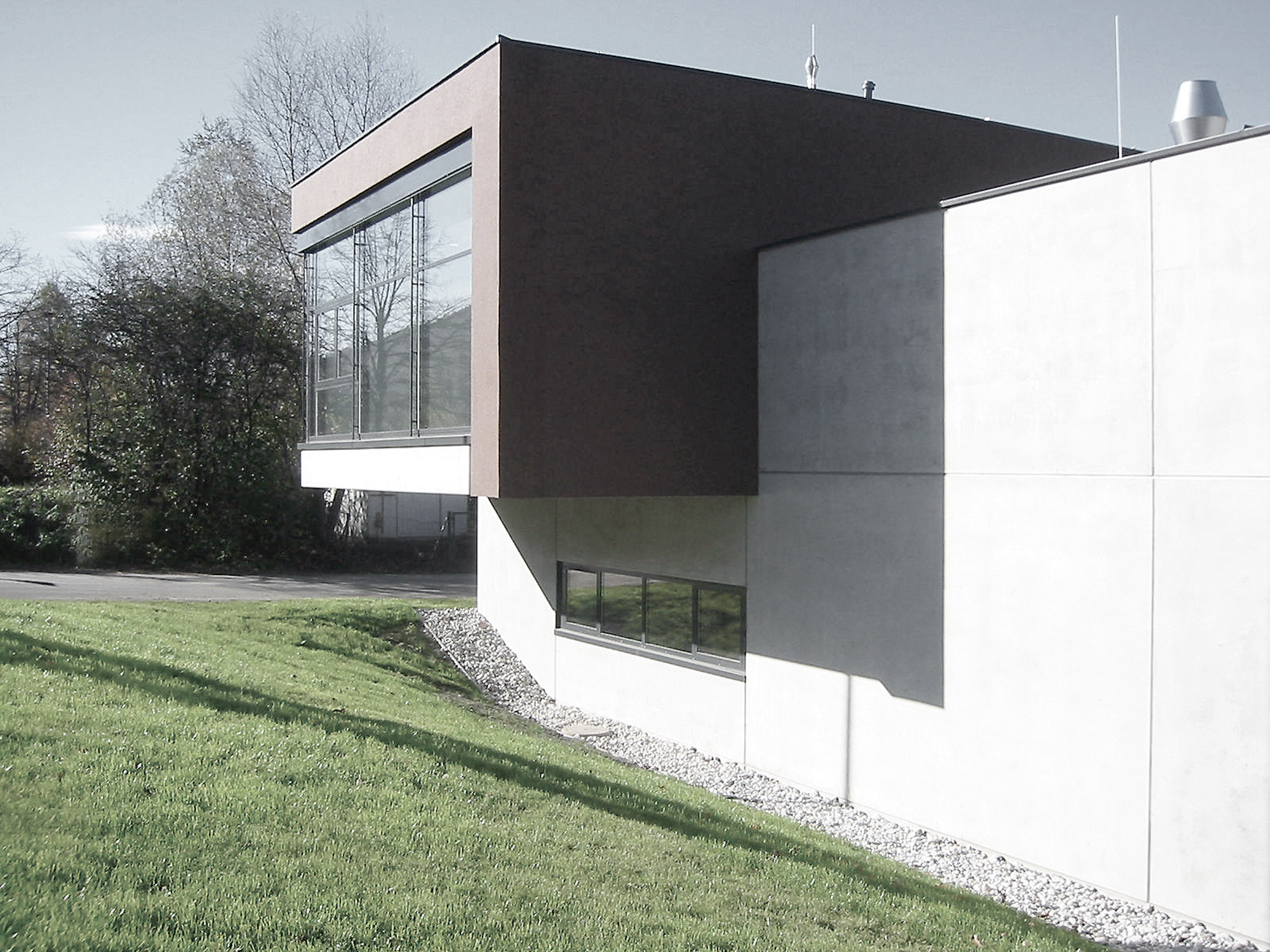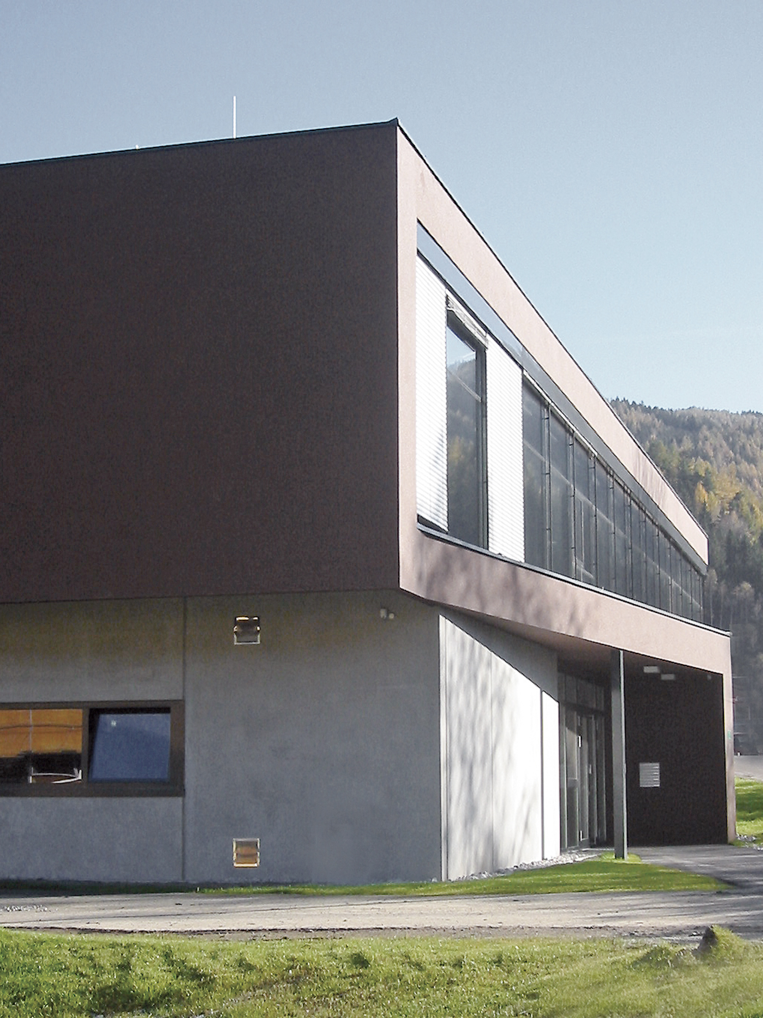 Der Neubau des Impulszentrums der INNOFINANZ durfte nach erfolgreicher Teilnahme am Wettbewerb umgesetzt werden und fügt sich nun geschickt in die Umgebung in Niklasdorf ein. Durch die Erhöhung des Bürobereichs vom Boden reagiert der Baukörper optimal auf das Gefälle und erzeugt mittels der Verglasung der oberen Bereiche einen offenen und dynamischen Eindruck.