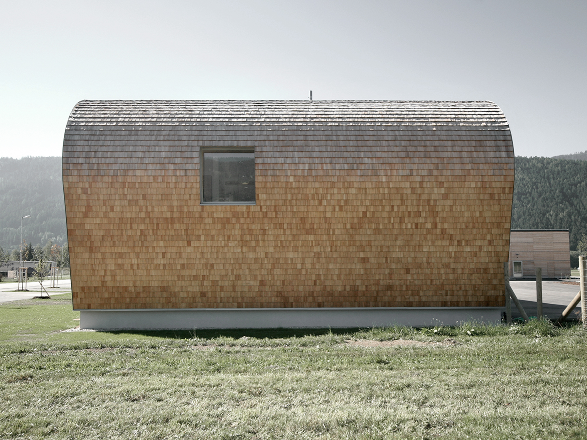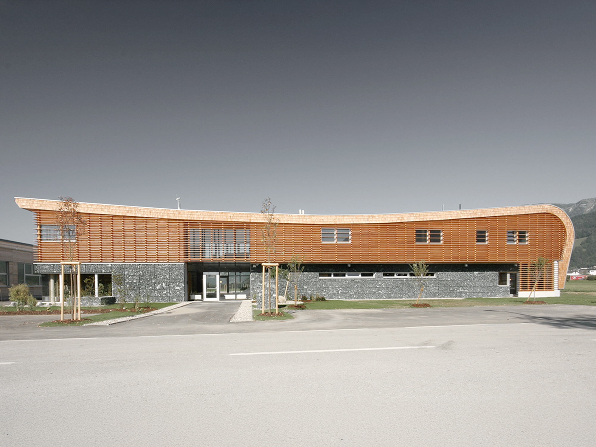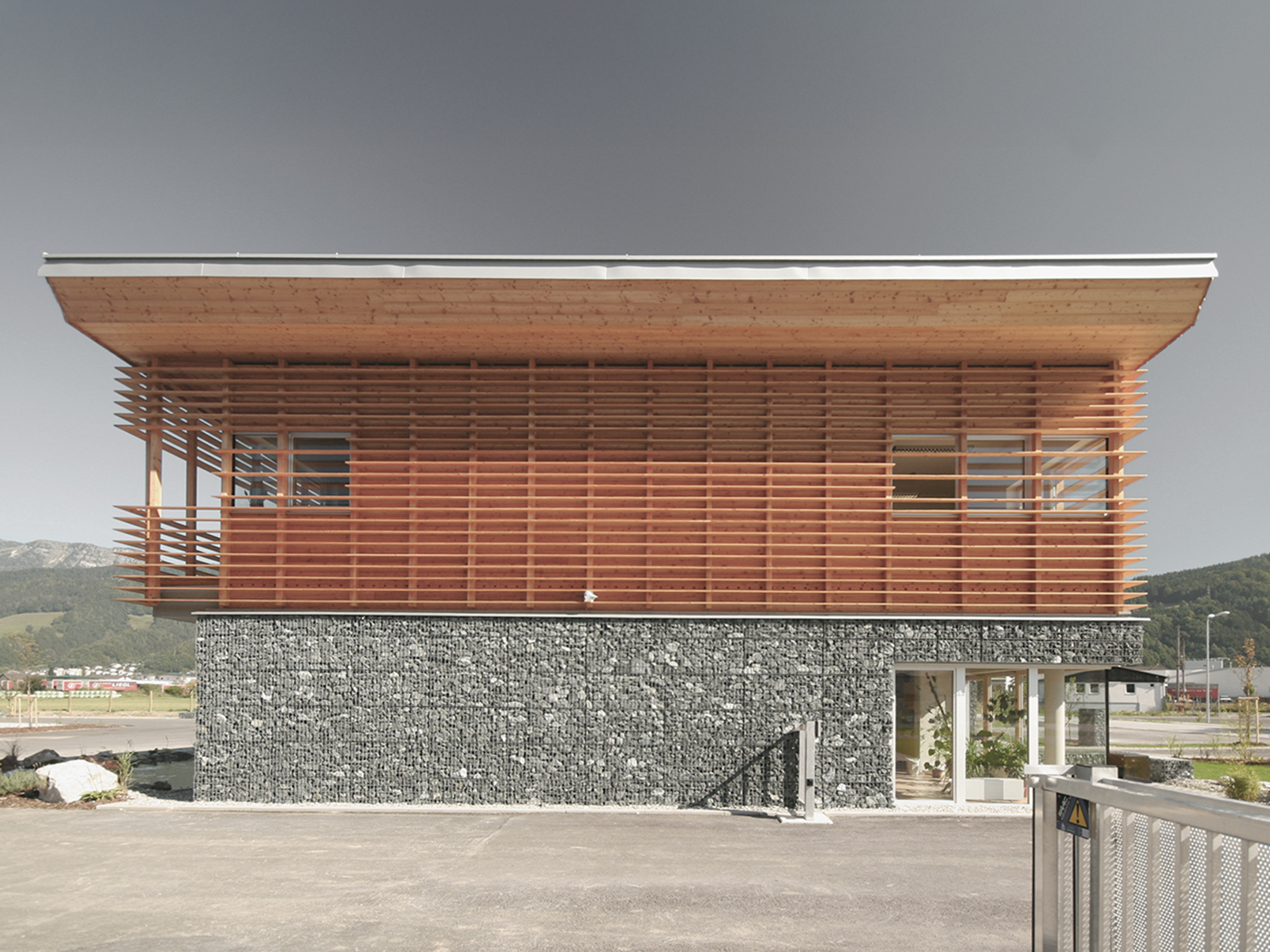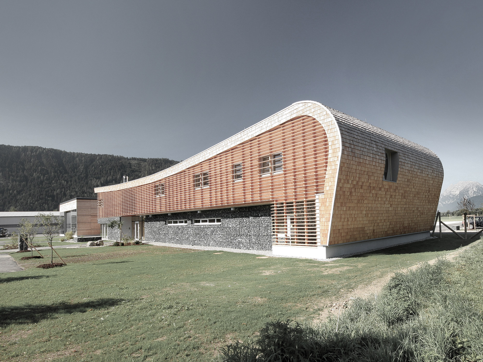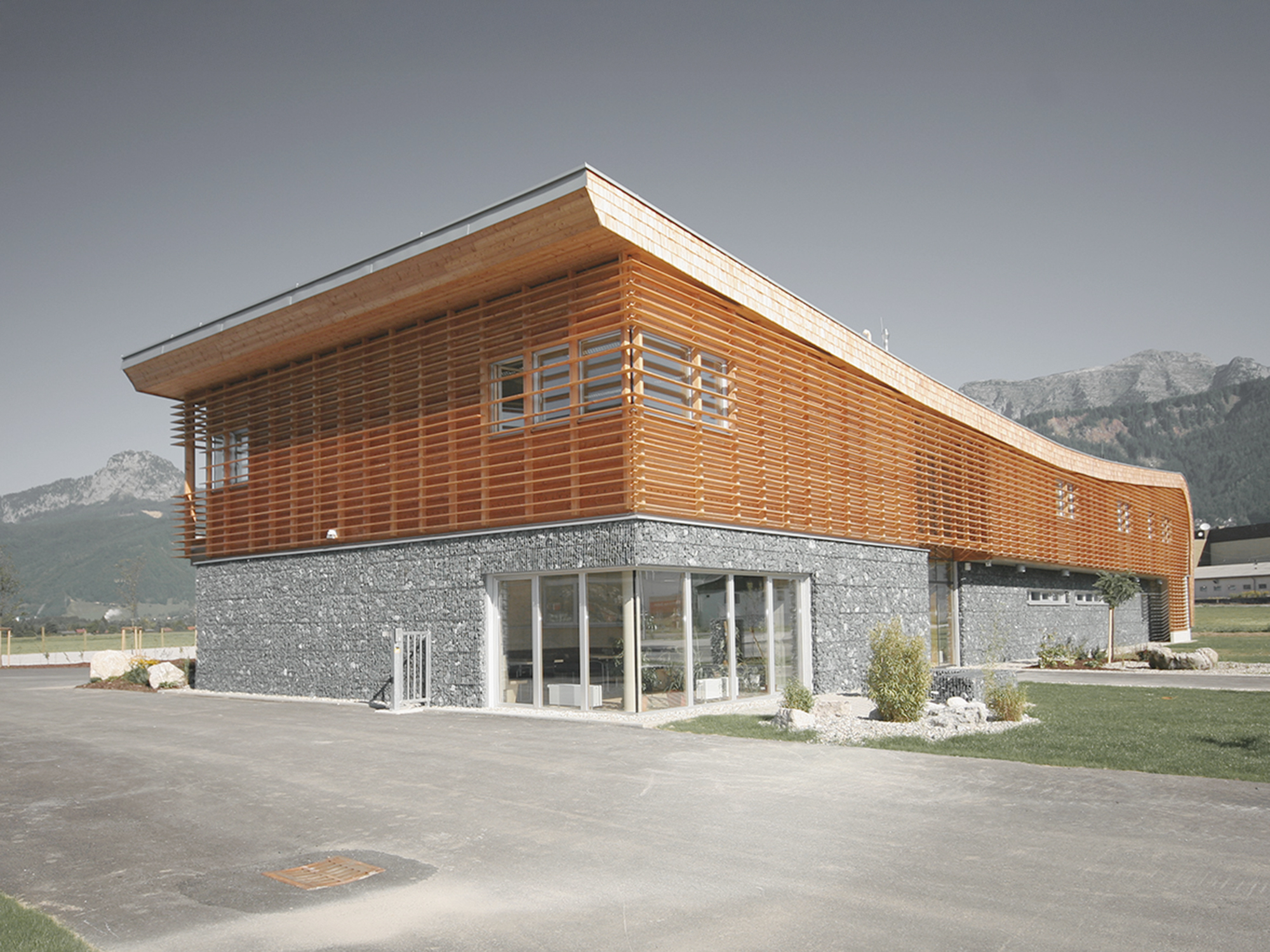 Der geschwungene Baukörper des Bürogebäudes der Wildbach- und Lawinenverbauung Liezen, sowie die kubische Lagerhalle mit angedockten Werkstätten bieten lichtdurchflutete Räumlichkeiten und passen sich aufgrund der naturverbundenen Materialität ideal der umgebenden Landschaft an. Die Nutzung unterschiedlichster Elemente, wie Lärchenholz, Glas, Stein, Beton und Wasser sind hierbei von Bedeutung.