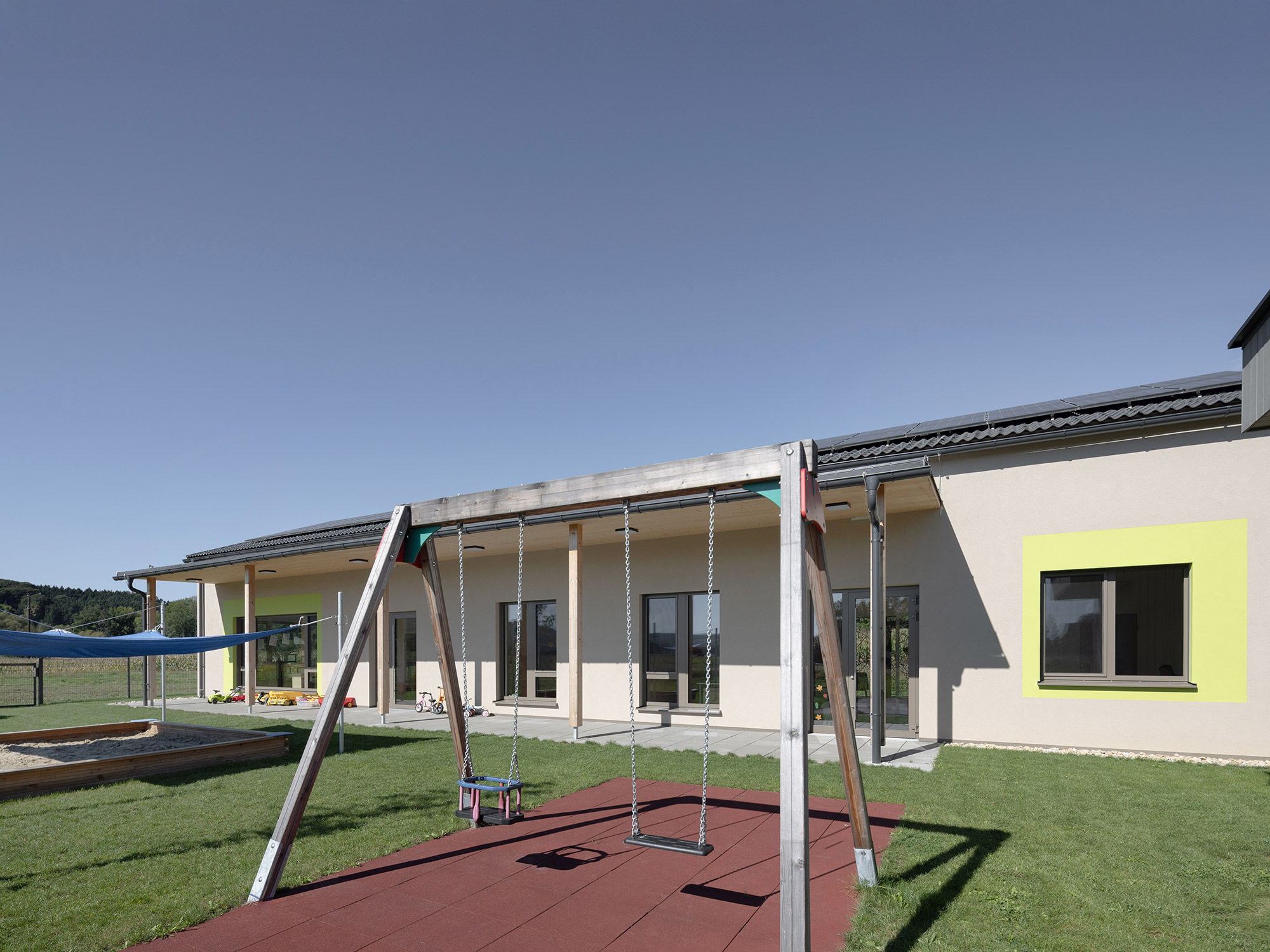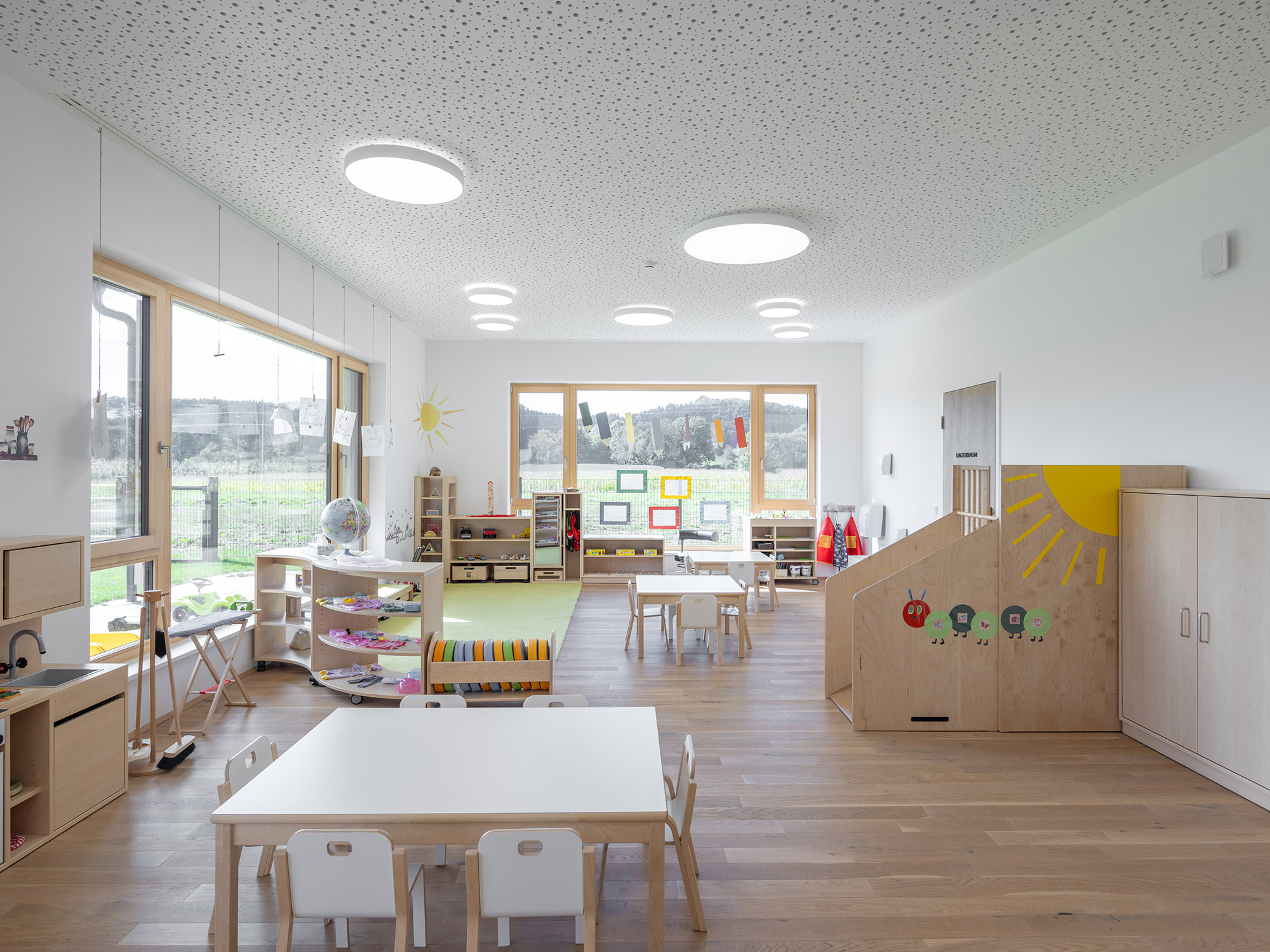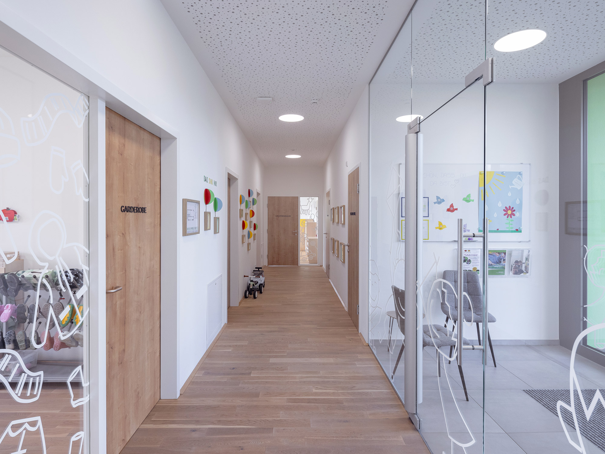 Das Generationenprojekt in Ebersdorf vereint Jung und Alt an einem Ort. In 1 ¾ Jahren Bauzeit entstanden zwei eingeschossige Gebäude, die einen geschützten Innenhof bilden. Die Kinderkrippe bietet helle, lichtdurchflutete Gruppenräume, die durch großzügige Verglasungen den Bezug zum Außenraum herstellen. Natürliche Materialien schaffen eine warme, ruhige Atmosphäre. Die Fassade wurde mit Farbakzenten gestaltet, eine PV-Anlage setzt ein nachhaltiges Zeichen. Das architektonische Konzept fördert Übersichtlichkeit, kurze Wege und flexible Nutzung für Kinder und pädagogisches Team. Außenbereiche und Spielzonen sind integraler Bestandteil und unterstützen Bewegung, Begegnung und spielerisches Lernen.