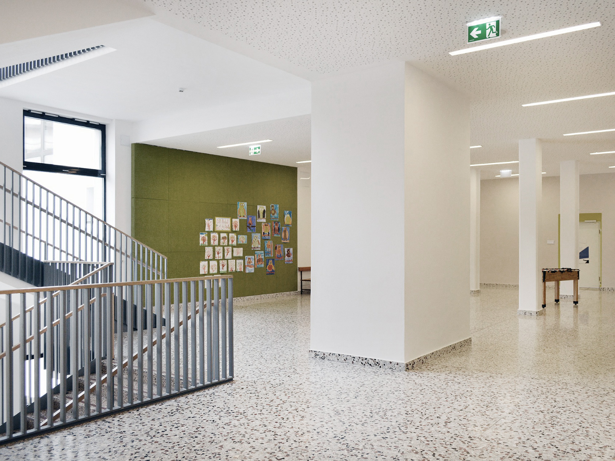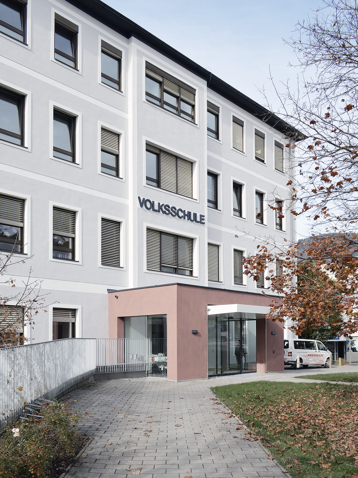 Im Zuge der Sanierung erhielt die Volksschule ein modernes Farb- und Materialkonzept, das Fassade und Innenräume optisch aufwertet. Helle, gut einsehbare Zugangsbereiche und großzügige Verglasungen sorgen für eine freundliche, lichtdurchflutete Atmosphäre. Natürliche Materialien wie Holz und gezielte Farb- und Lichtakzente schaffen eine zeitgemäße Lernumgebung. Die Schule ist nun barrierefrei und entspricht den aktuellen Sicherheitsstandards.