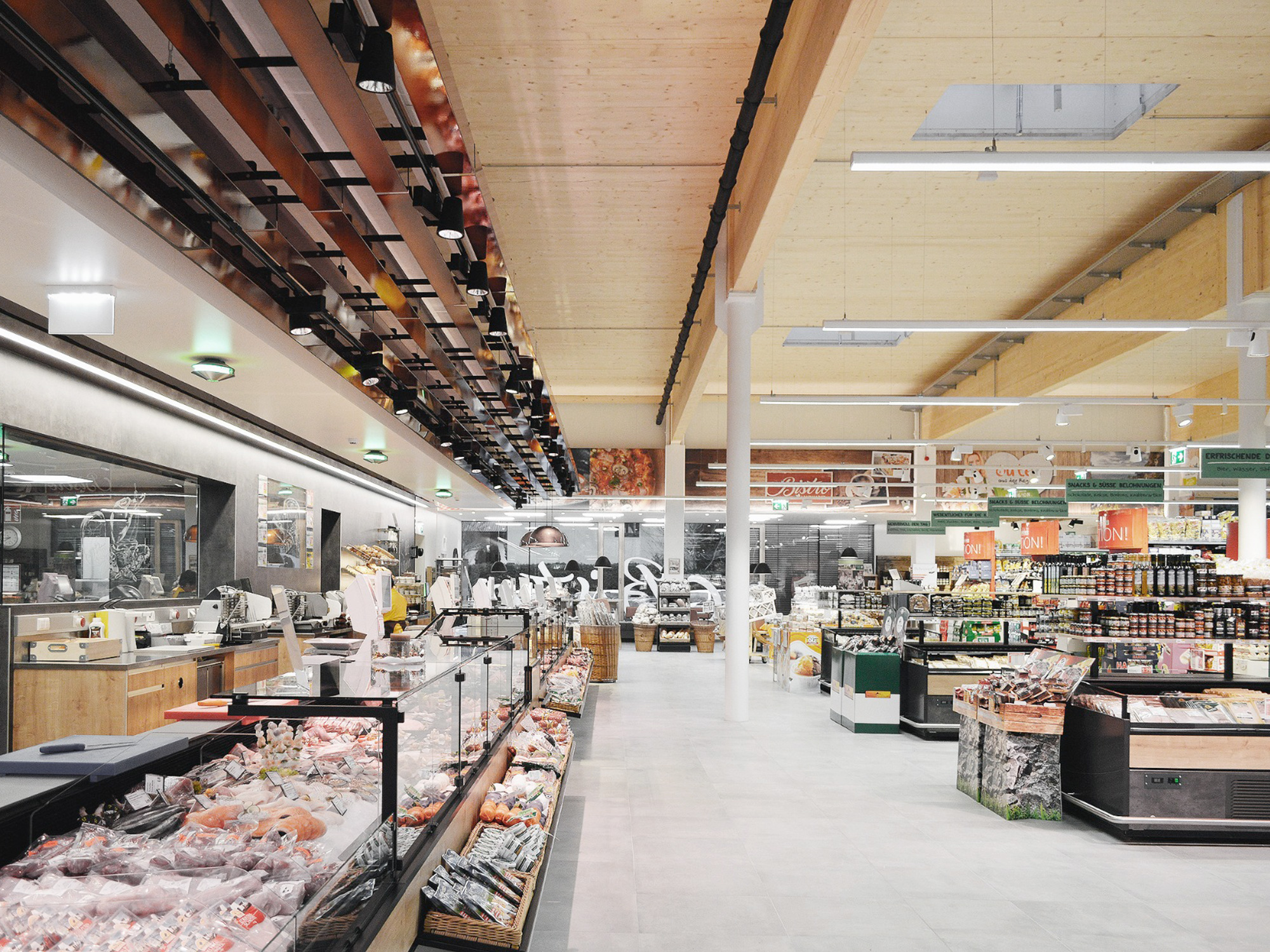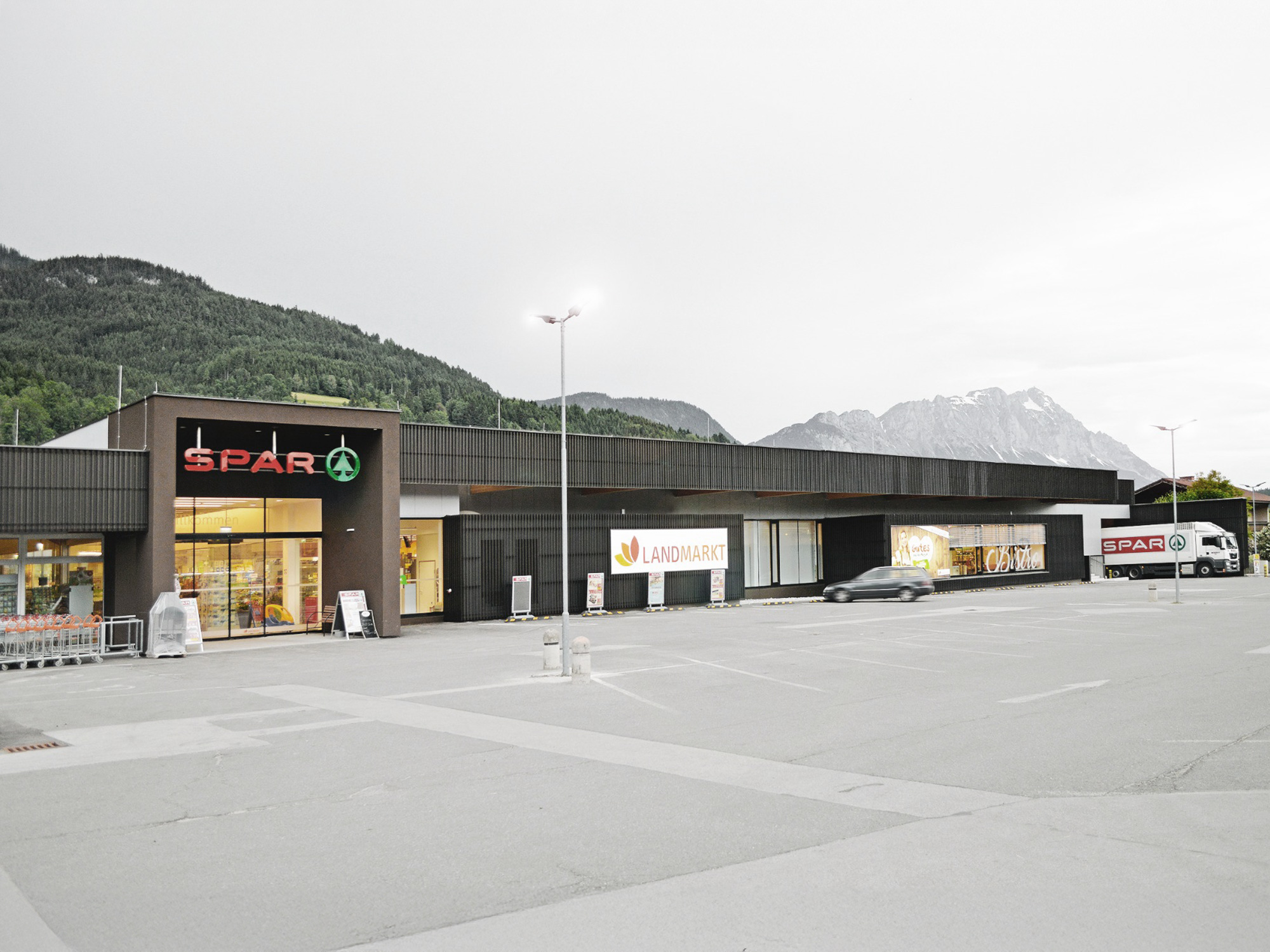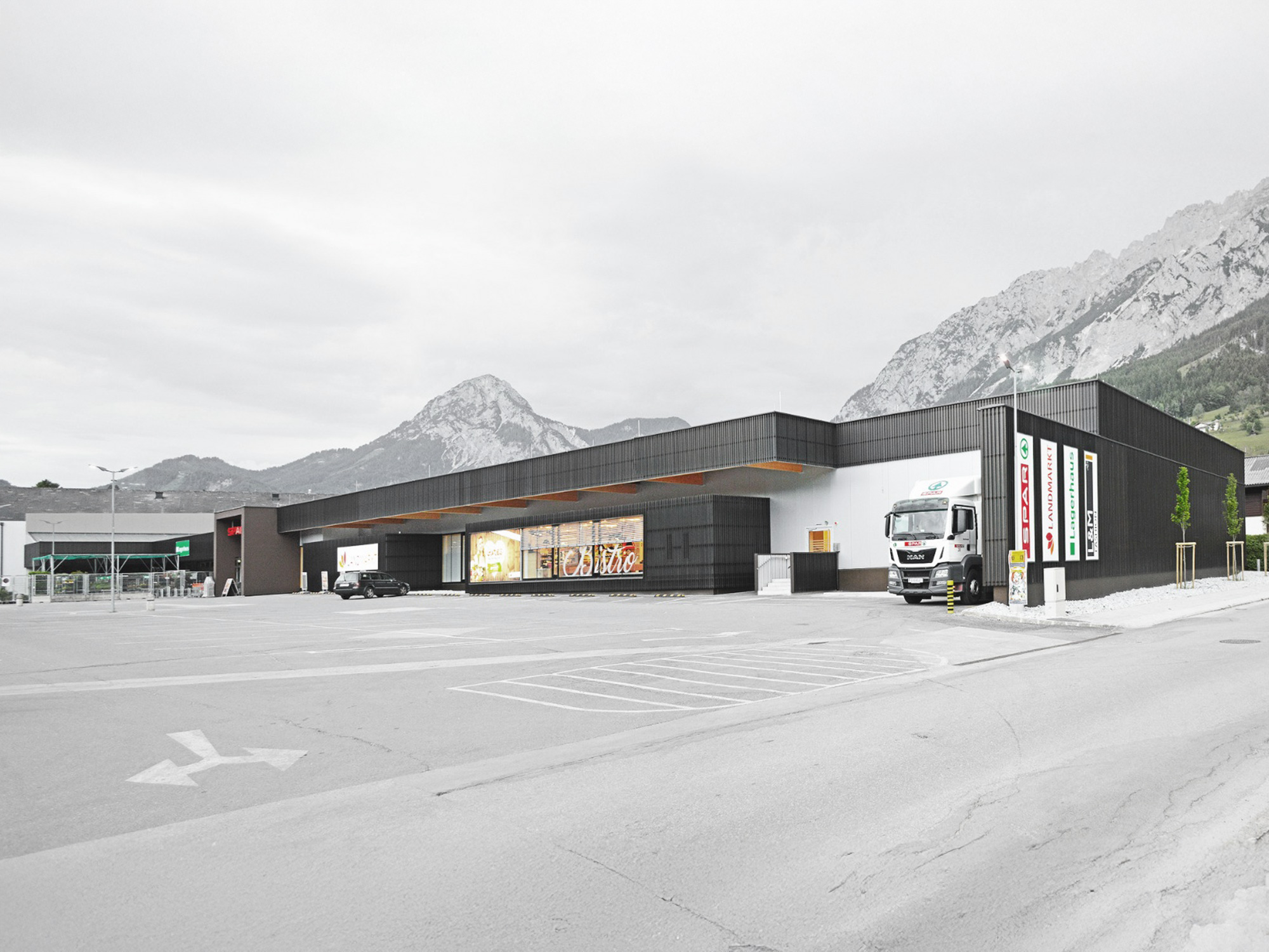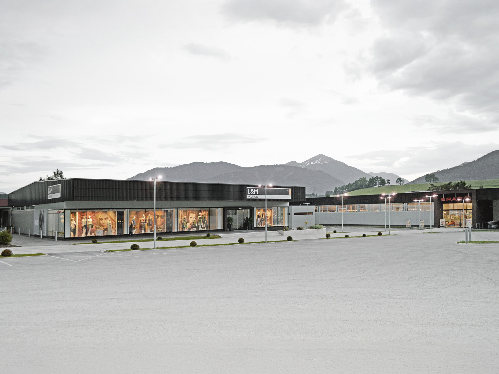 Die beiden dynamischen Verkaufsgebäude des Spar-Landmarkt und L&M wurden in Beton-Holz-Bauweise nahe dem Zentrum Gröbmings errichtet. Besonders die durchgängige Dachuntersicht aus Holz sorgt für eine angenehme und natürliche Atmosphäre in den Verkaufsräumen. Die Fassade erzeugt durch konstruktive Details ein einzigartiges Verhältnis zwischen Transparenz und Geschlossenheit in Abhängigkeit vom Standpunkt des Betrachters. Die gesamte Konstruktion wurde mit dem neuen Material verkleidet und bildet damit ein einheitliches Ganzes. Energetisch wurde die Wahl zu Fernwärme und Wärmerückgewinnung als Energielieferanten getroffen. Die großräumigen Verkaufsflächen werden mithilfe einer Bodenplatte durch Betonkernaktivierung innovativ und sparsam beheizt und sorgen somit für ein optimales Raumgefühl.