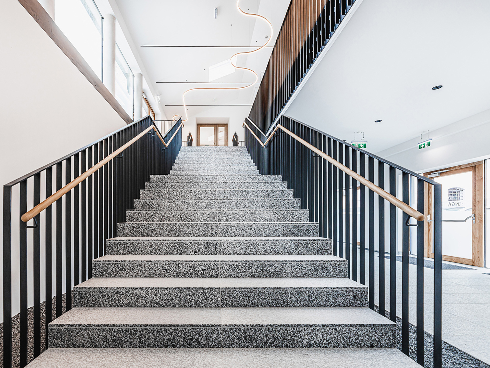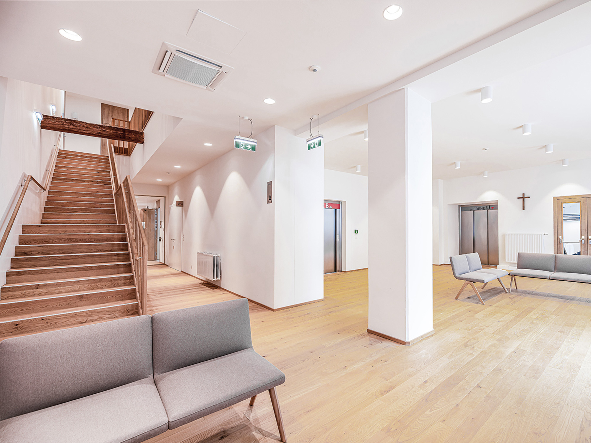 Das Benediktinerstift Admont führte mit der behutsamen Umnutzung der ehemaligen Stiftsschmiede ein leerstehendes Gebäude einer zeitgemäßen Nutzung zu und schuf ein modernes Gesundheitszentrum mit hoher Aufenthaltsqualität. Zwei neu gestaltete Vorplätze bilden eine klare Hofsituation: einen Ankunftsbereich für Patienten und einen geschützten Platz mit Bezug zum Stift. Die historische Bausubstanz blieb erhalten, während natürliche Materialien wie Holz, Terrazzo und Stahl den Bestand modern interpretieren. Helle, barrierefreie Räume bieten Platz für Ärztinnen, Therapeuten und Masseure. Neue Dachgauben und eine geordnete Dachstruktur stärken den Baukörper. Das Ergebnis ist ein harmonisches Ensemble, das Geschichte bewahrt und Zukunft ermöglicht.