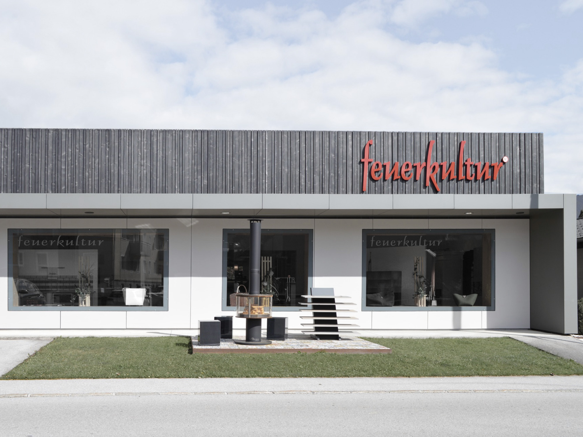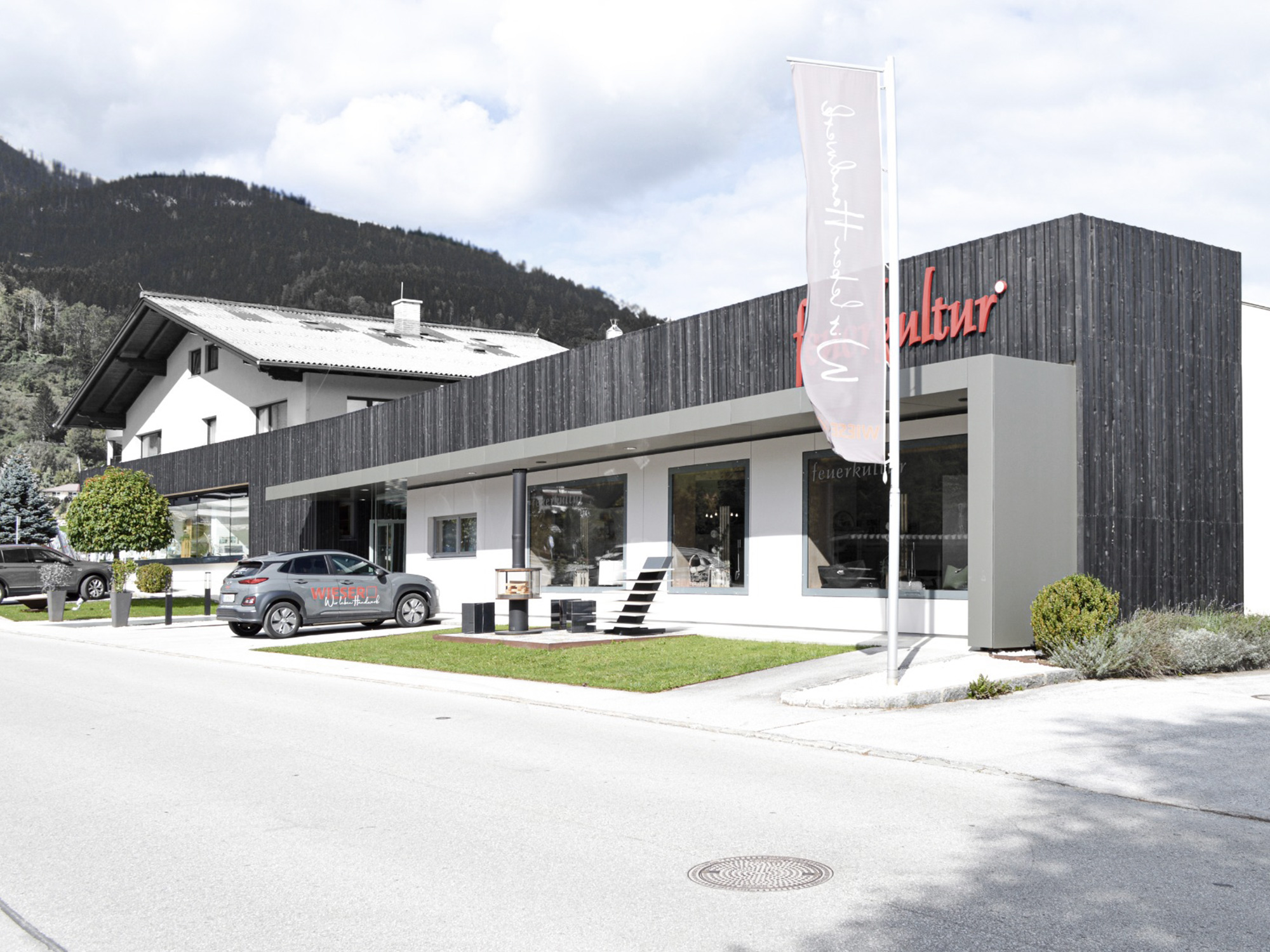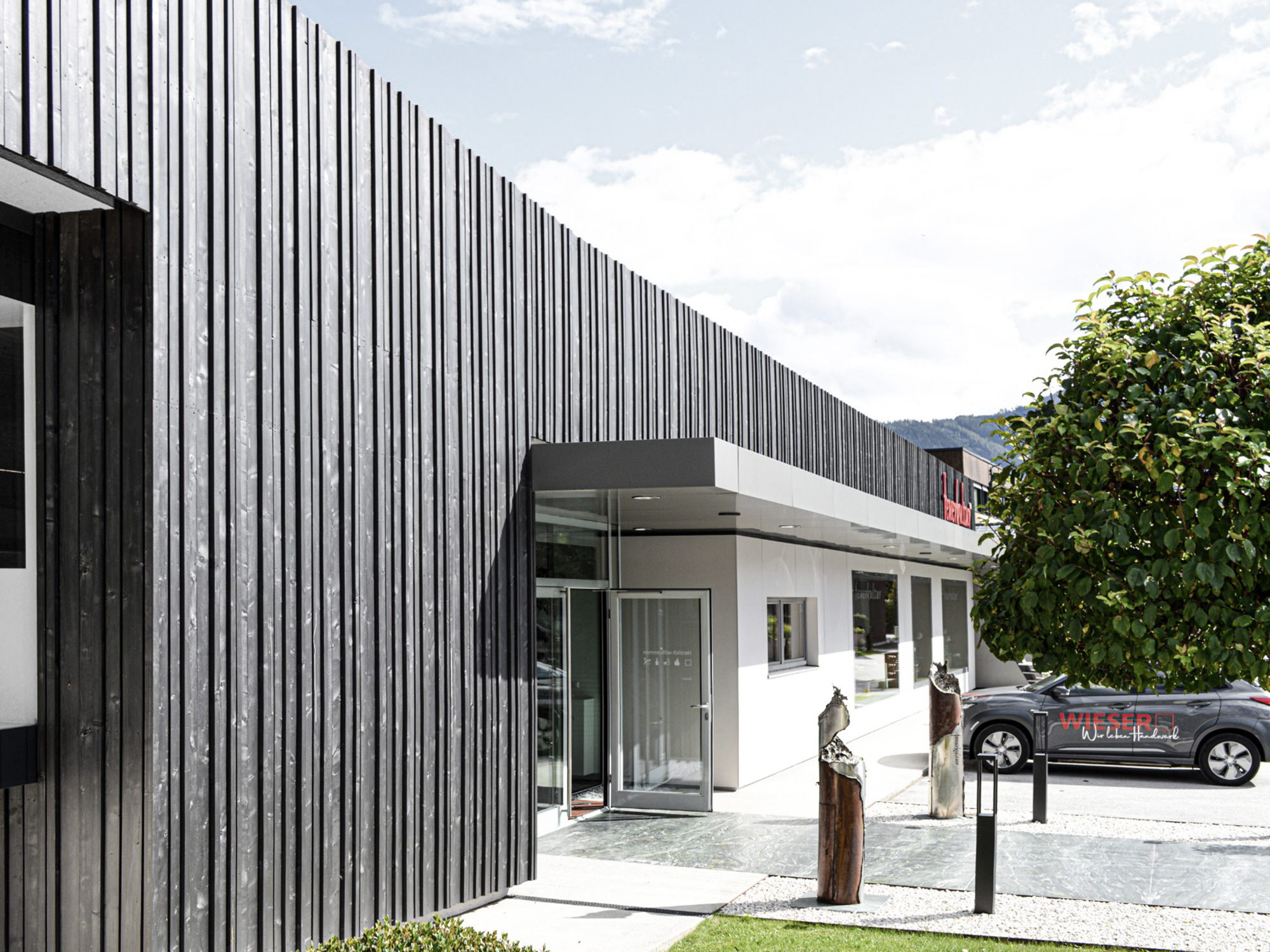 Anthrazitfarbenes Holz in Kombination mit exklusiven Natursteinplatten im Sockelbereich bilden die elegante neue Fassade der Firma Wieser Handwerk GmbH. Durch die klare Form und Schlichtheit der Fassadengestaltung wird das Geschäftshaus Teil des Ortes und erzeugt einen unverwechselbaren Charakter in der Marktgemeinde Gröbming.