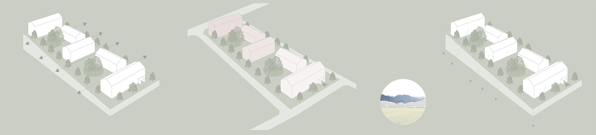 Durch die gezielt gerichtete Anordnung der Baukörper wird der langgestreckte Bauplatz räumlich gegliedert und es öffnen sich zwei großzügige gemeinschaftliche Höfe Richtung Westen. Diese grünen Begegnungszonen stellen die zentrale Qualität des neuen Wohnquartiers dar und schaffen ein ausgewogenes Gleichgewicht zwischen Gemeinschaft und Privatheit – sie lassen einen intensiven Austausch der Bewohner zu, ermöglichen aber gleichzeitig eine ausreichende Abgrenzung zwischen privaten Gärten und öffentlichen Kommunikationszonen.