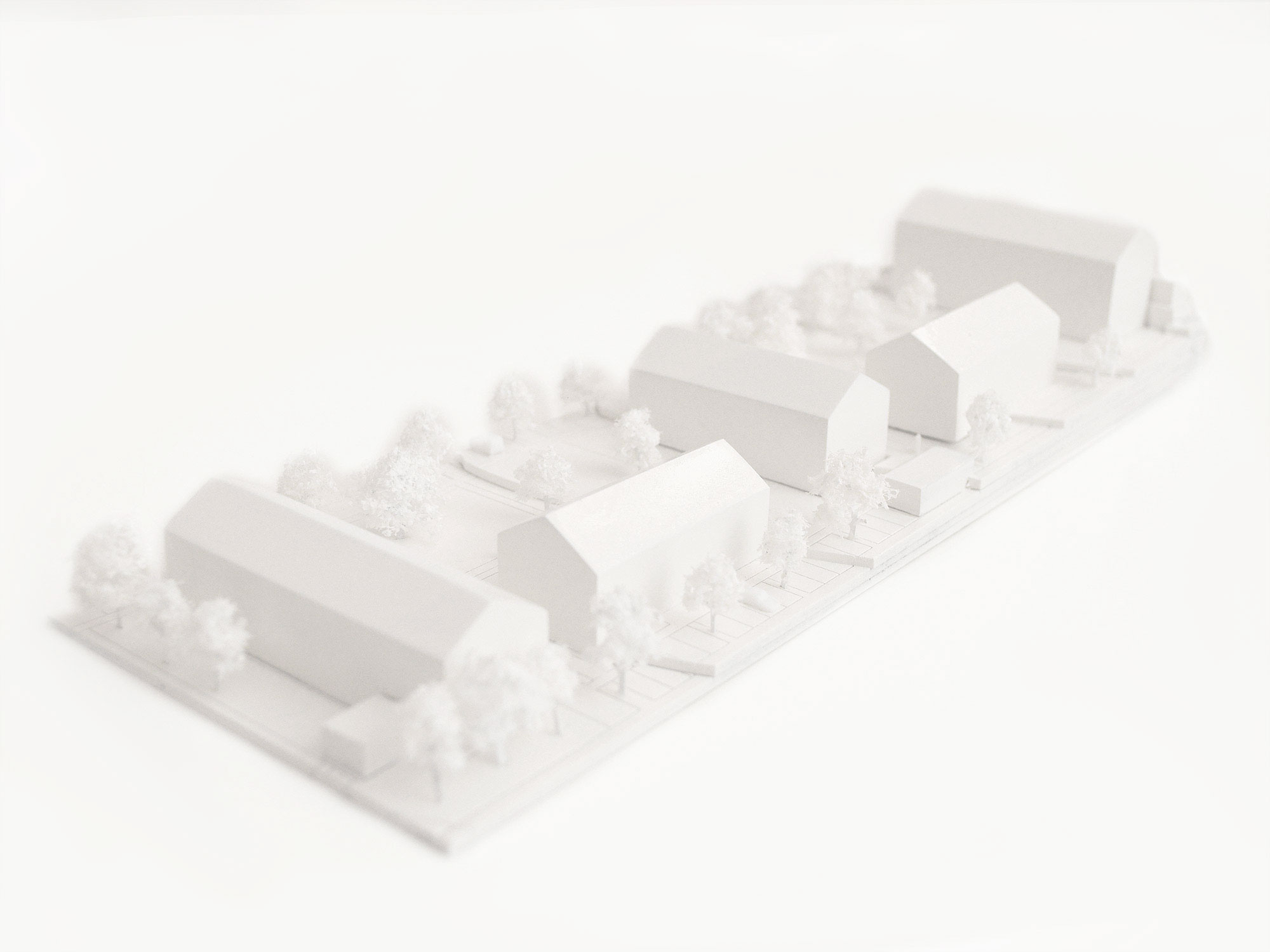 Durch die schlicht gehaltene Fassadengestaltung mittels weißer Putzfassade fügen sich die fünf Baukörper ungezwungen in das vielfältige umgebende Ortsbild ein und stehen in keiner Konkurrenz zum prägenden Landschaftsbild. Gezielt gesetzte Akzente aus heimischem Holz komplettieren das Gesamtkonzept und unterstreichen als dezente Geste den wohnlichen Charakter der neuen Siedlung.