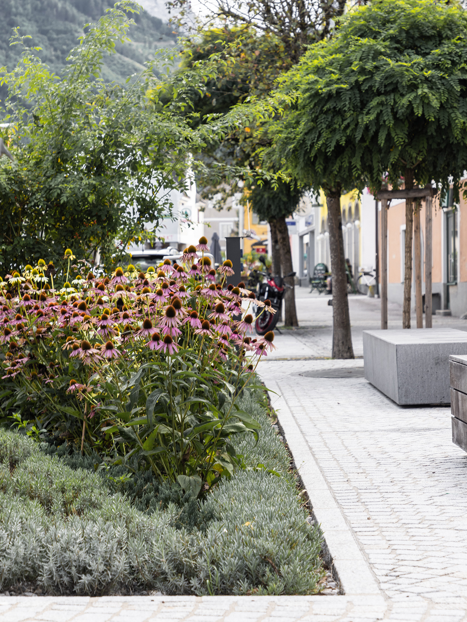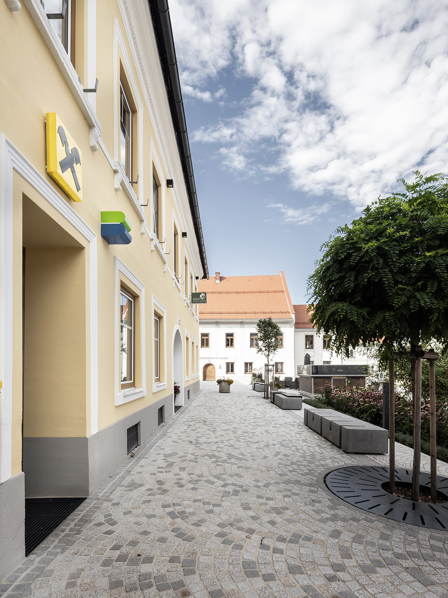 Der Marktplatz in Sankt Gallen wurde auf Basis einer umfassenden Analyse neu gestaltet, um die Aufenthaltsqualität zu steigern und einen lebendigen Dorfplatz zu schaffen. Die dichte Bebauung und starke Verkehrsbelastung hatten den Platz zuvor räumlich und funktional isoliert. Ziel war daher, den Ortskern zu beruhigen und Grünflächen zu integrieren. Durch die Verlagerung der Stellplätze entstand Raum für begrünte Inseln und neue Fußwege. Schlichtes Mobiliar und entsiegelte Flächen schaffen ein harmonisches, offenes Platzbild. Bestehende Pflasterungen wurden übernommen und neu verlegt, um ein ruhiges, einheitliches Erscheinungsbild zu erzielen. Ergänzt wird die Neugestaltung durch die behutsame Revitalisierung von Markt 32 zum „Doktorhaus“ – einem modernen Zentrum für medizinische Versorgung im Ortskern.